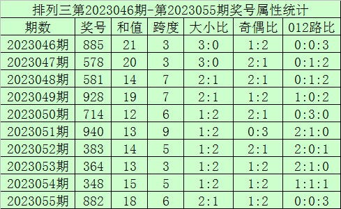 上期记忆:胪列三第2023055期开奖号:882,奖号和值:18,奇偶比1:2,大小比2:1。